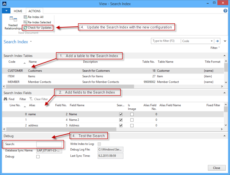 OnInsert() UpdateIndex(0); OnModify() UpdateIndex(1); OnDelete() UpdateIndex(2); OnRename() UpdateIndex(3); LOCAL UpdateIndex(Type : Integer) //Type: 0 = INSERT, 1 = MODIFY, 2 = DELETE, 3 = RENAME RecRef.GETTABLE(Rec); xRecRef.GETTABLE(xRec); POSSearch.UpdateIndex(RecRef, xRecRef, Type); - An update action is created in the table POS Search Action (10000769) for every entry changed.